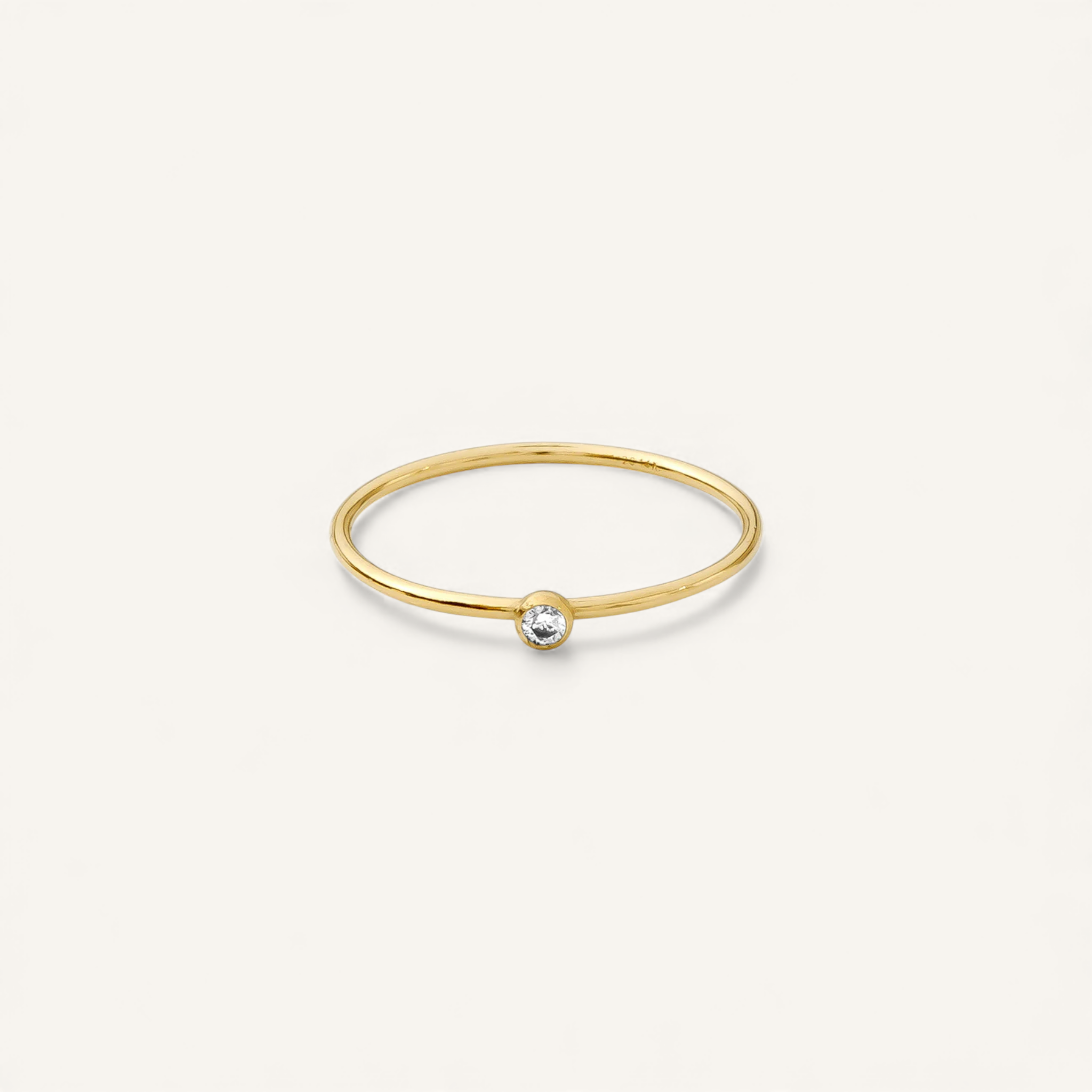 Minimalist in the best way. This gold-filled ring holds a white cubic zirconia in a diamond-inspired April birthstone shade. Wear it solo for a clean, effortless look or stack it to add soft dimension to your favourite rings.