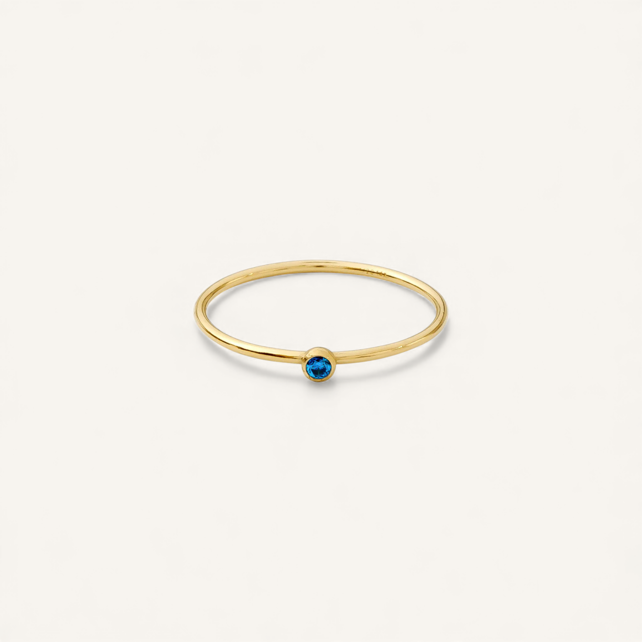 A wee pop of blue that lifts any look. This dainty gold-filled ring holds a blue cubic zirconia that catches the eye without trying. Perfect on its own, even better in a stack — a little colour for your everyday.