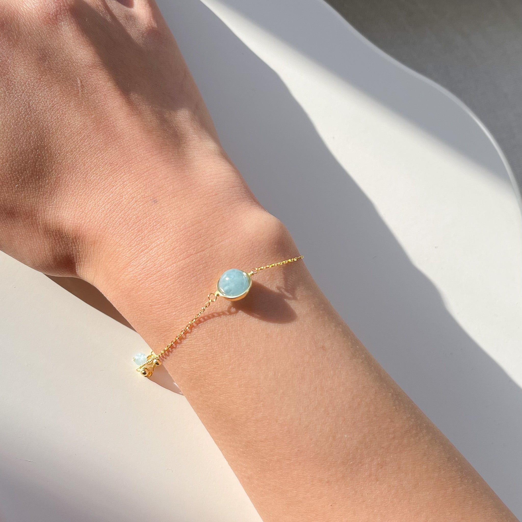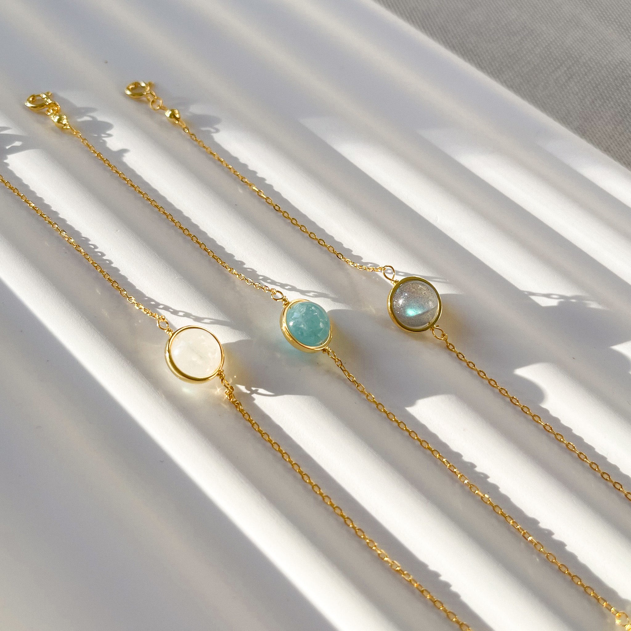 One gemstone, right in the middle. This delicate bracelet features a round aquamarine or grey moonstone on a fine gold-plated sterling silver chain.